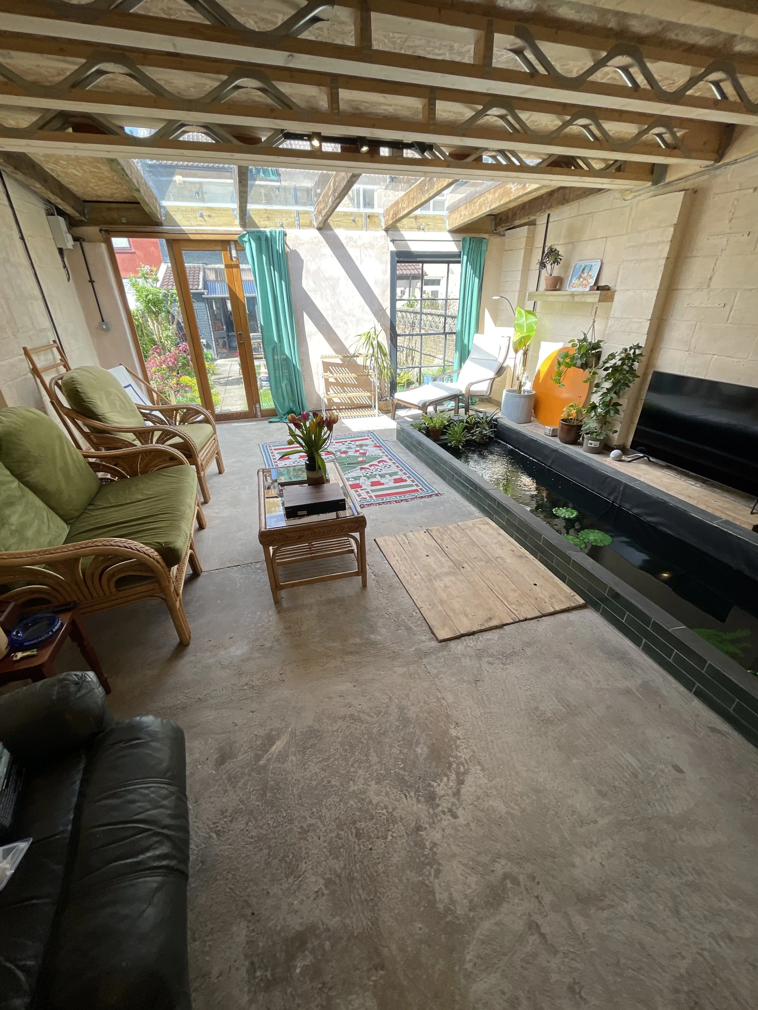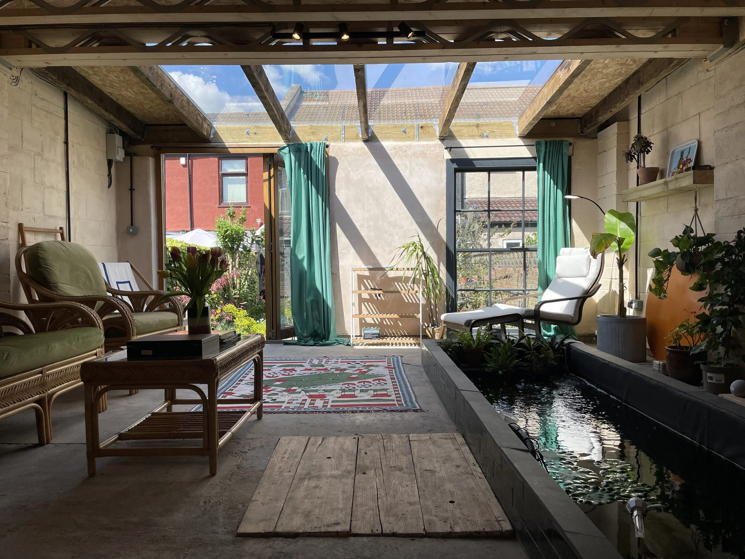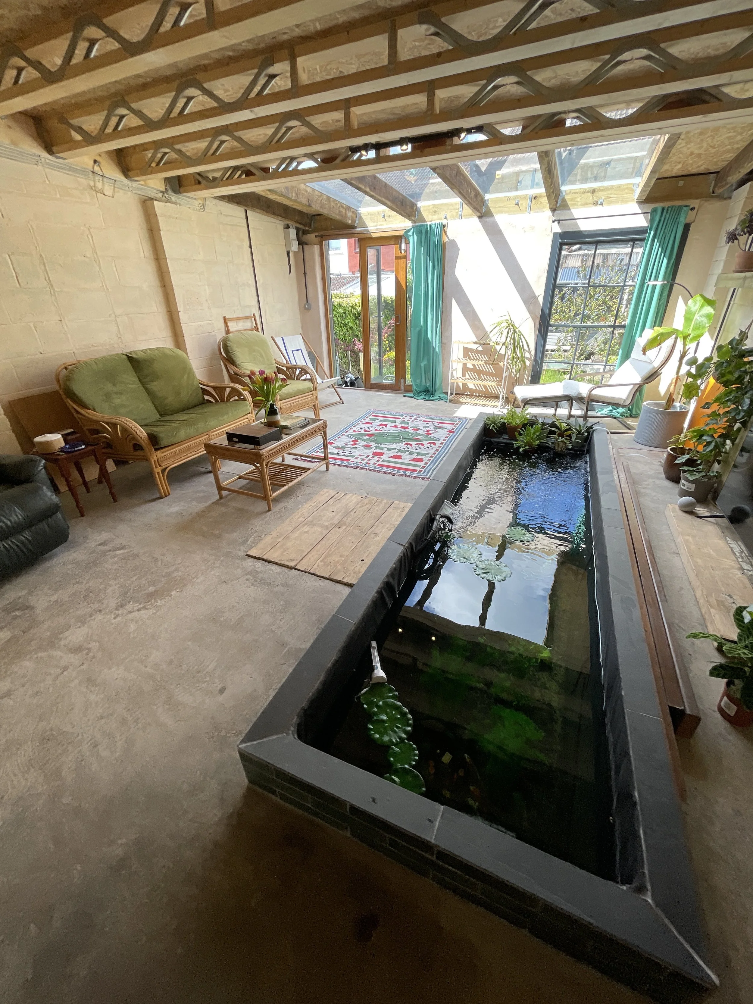 We recently renovated this inner-city garage into the ultimate hangout spot and couldn't be happier with the results. This urban oasis now boasts a stunning pond feature and plenty of entertainment options with a TV, seating, and dart board. The space is filled with plenty of light by the sun-catching skylights and bi-fold doors.