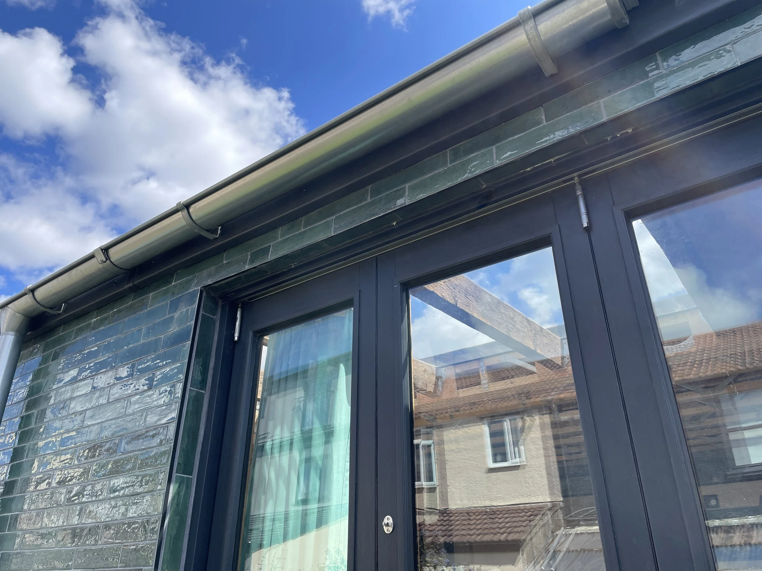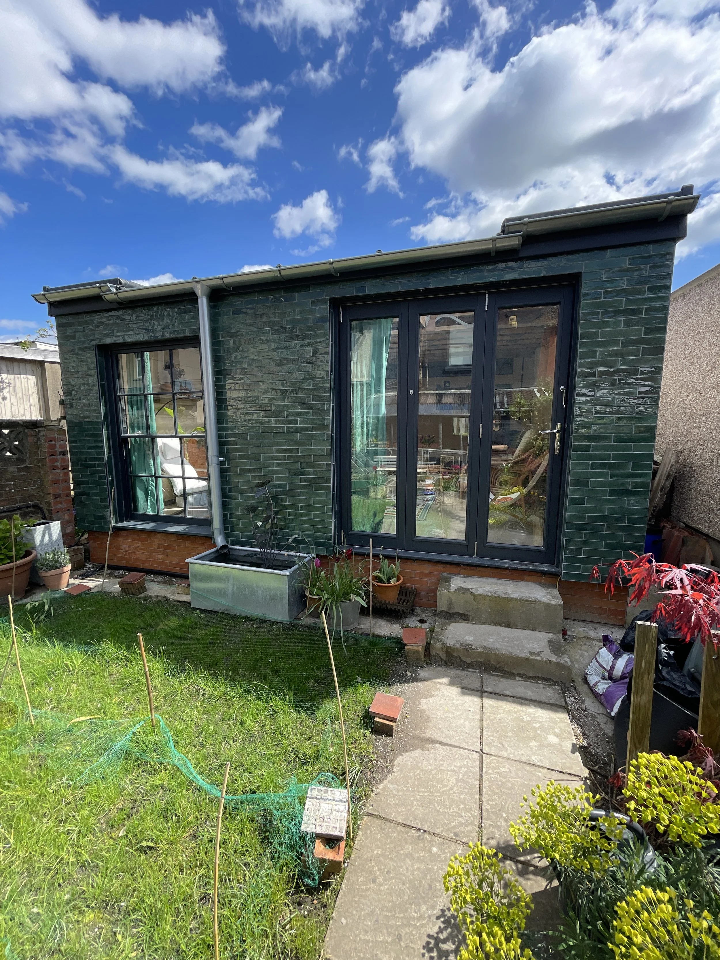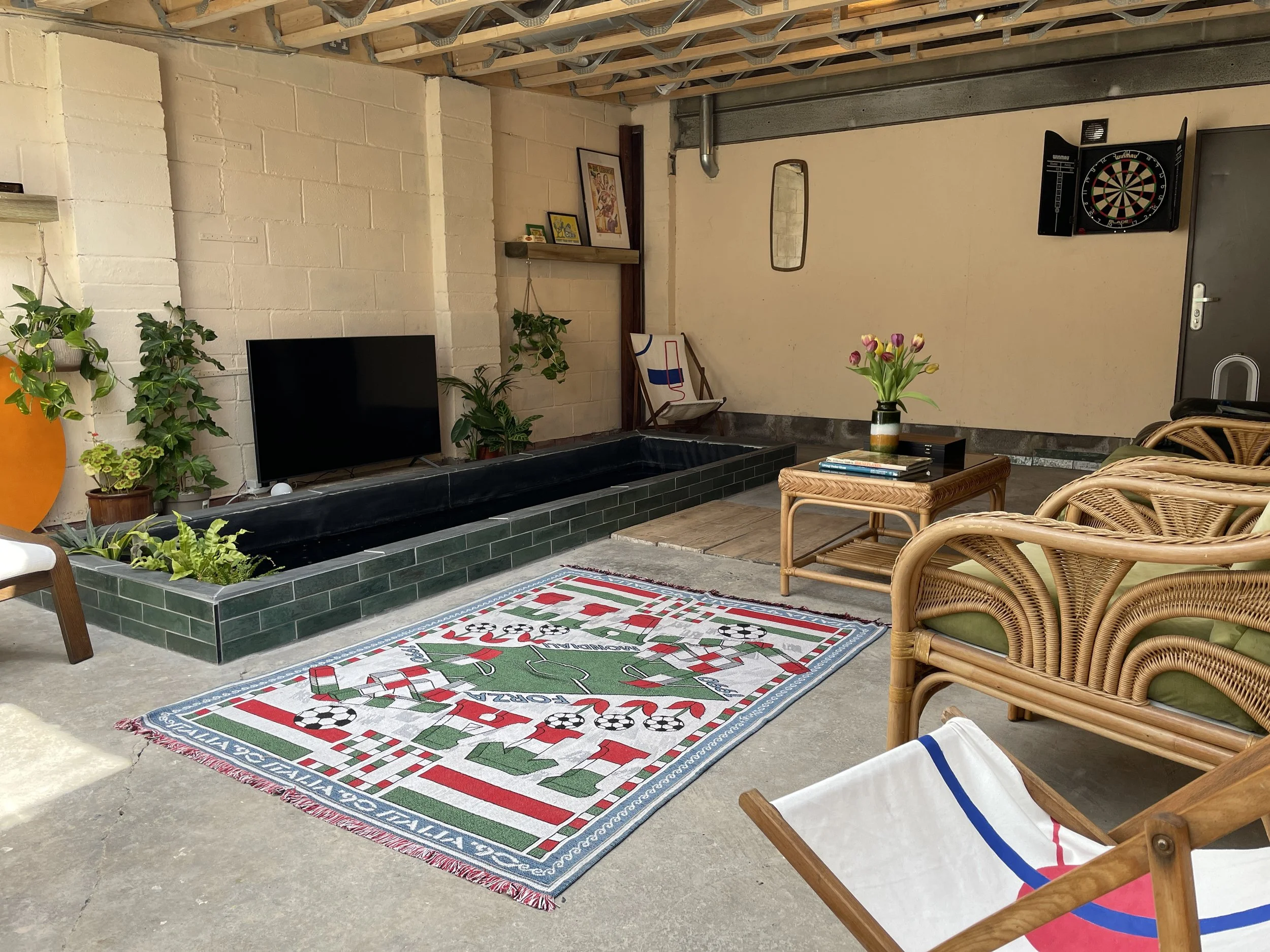 We recently renovated this inner-city garage into the ultimate hangout spot and couldn't be happier with the results. This urban oasis now boasts a stunning pond feature and plenty of entertainment options with a TV, seating, and dart board. The space is filled with plenty of light by the sun-catching skylights and bi-fold doors.
