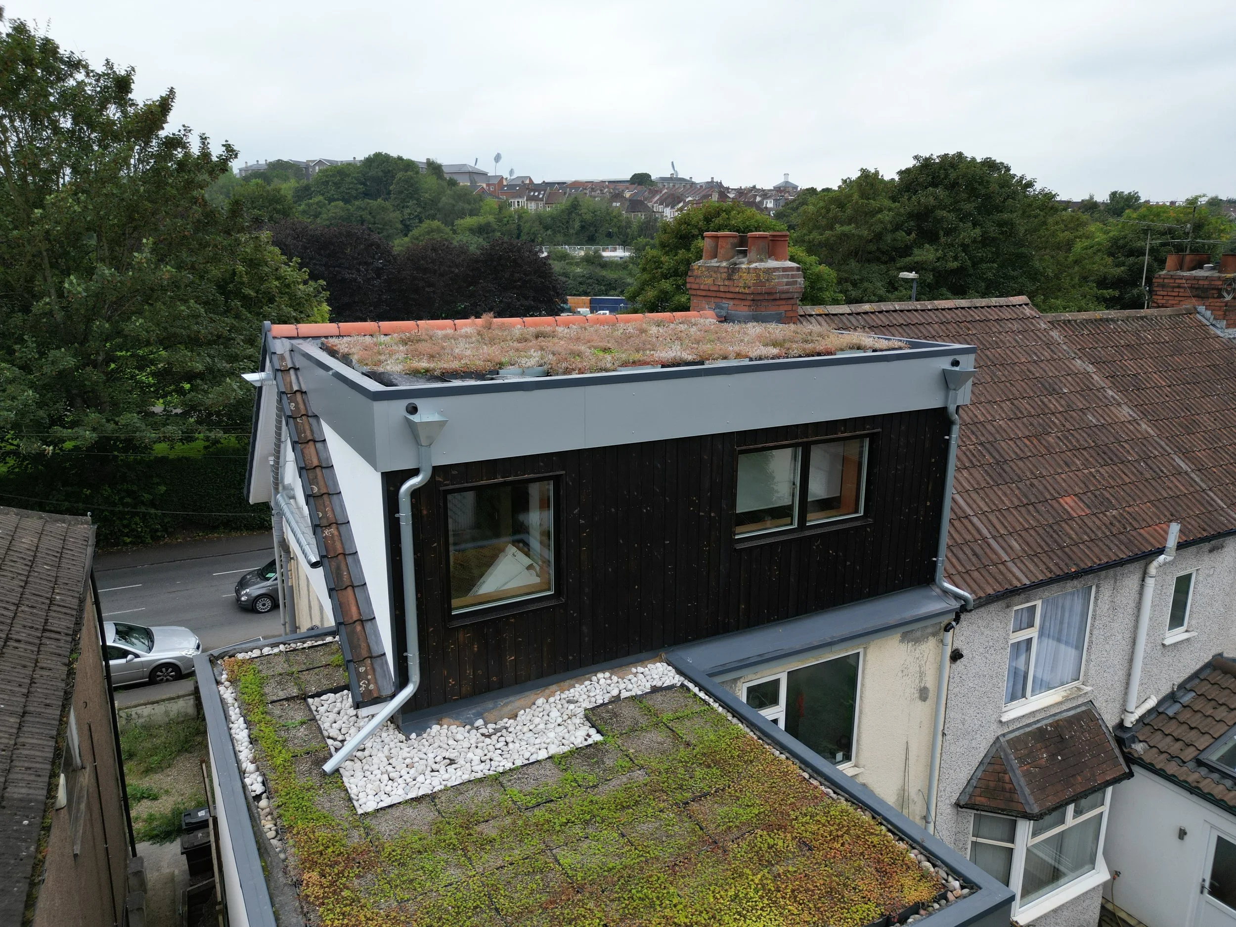 See below for our project gallery of this EnerPHit standard loft extension. Complete with timber cladding, triple-glazed windows, wood fibre insulation, steel frame, full whole house MVHR system, and the repurposing of original clay roof tiles.